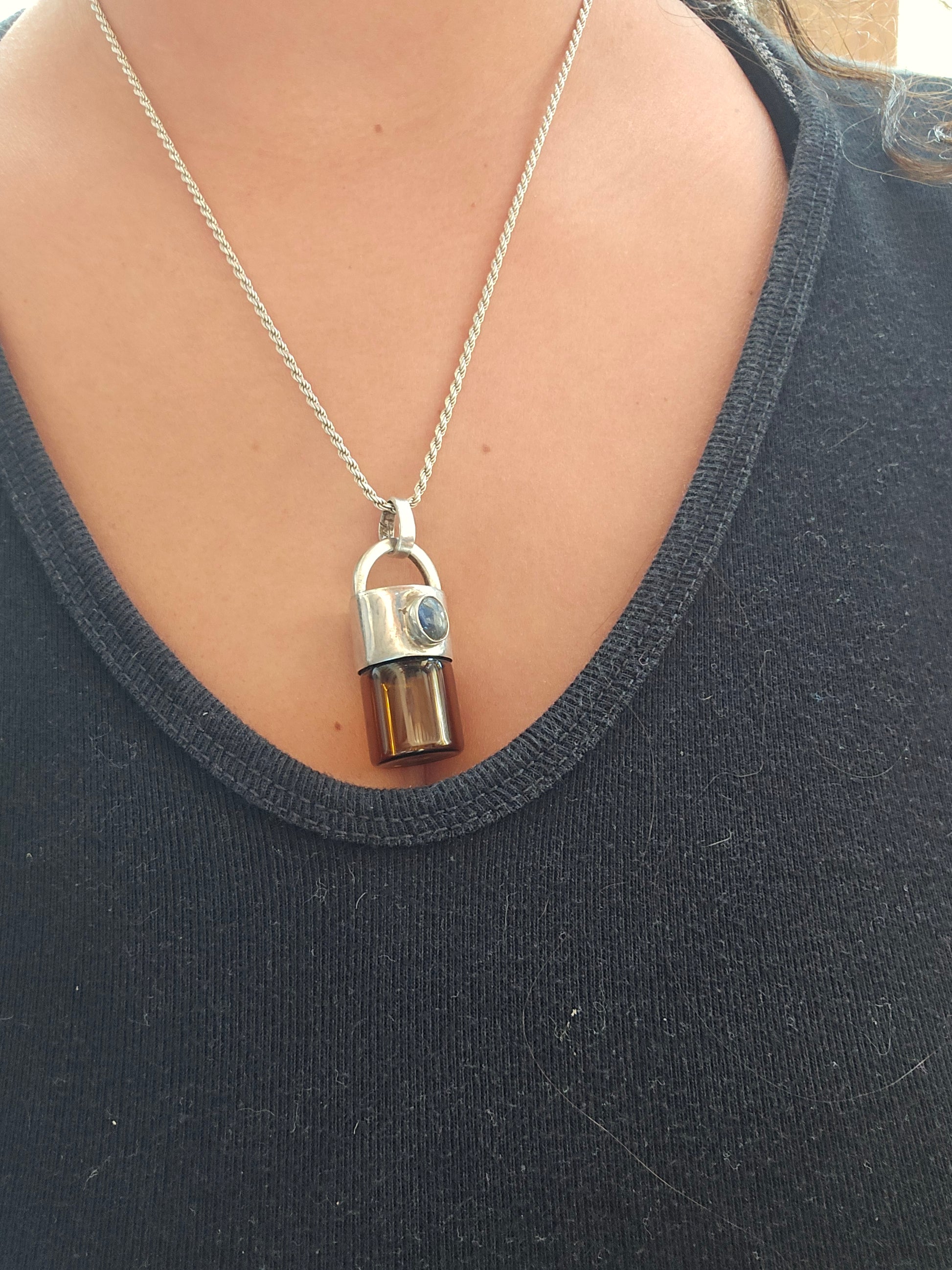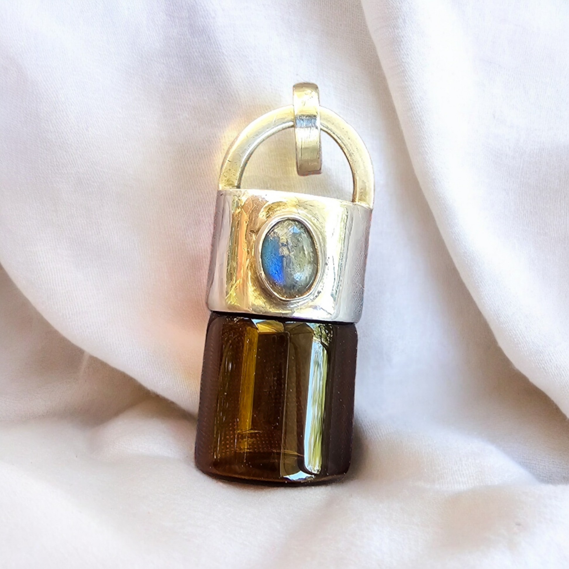 Botellita colgante para guardar esencias, recuerdos o lo que tú quieras guardar. Con una Labradorita en su centro. La botellita es de vidrio