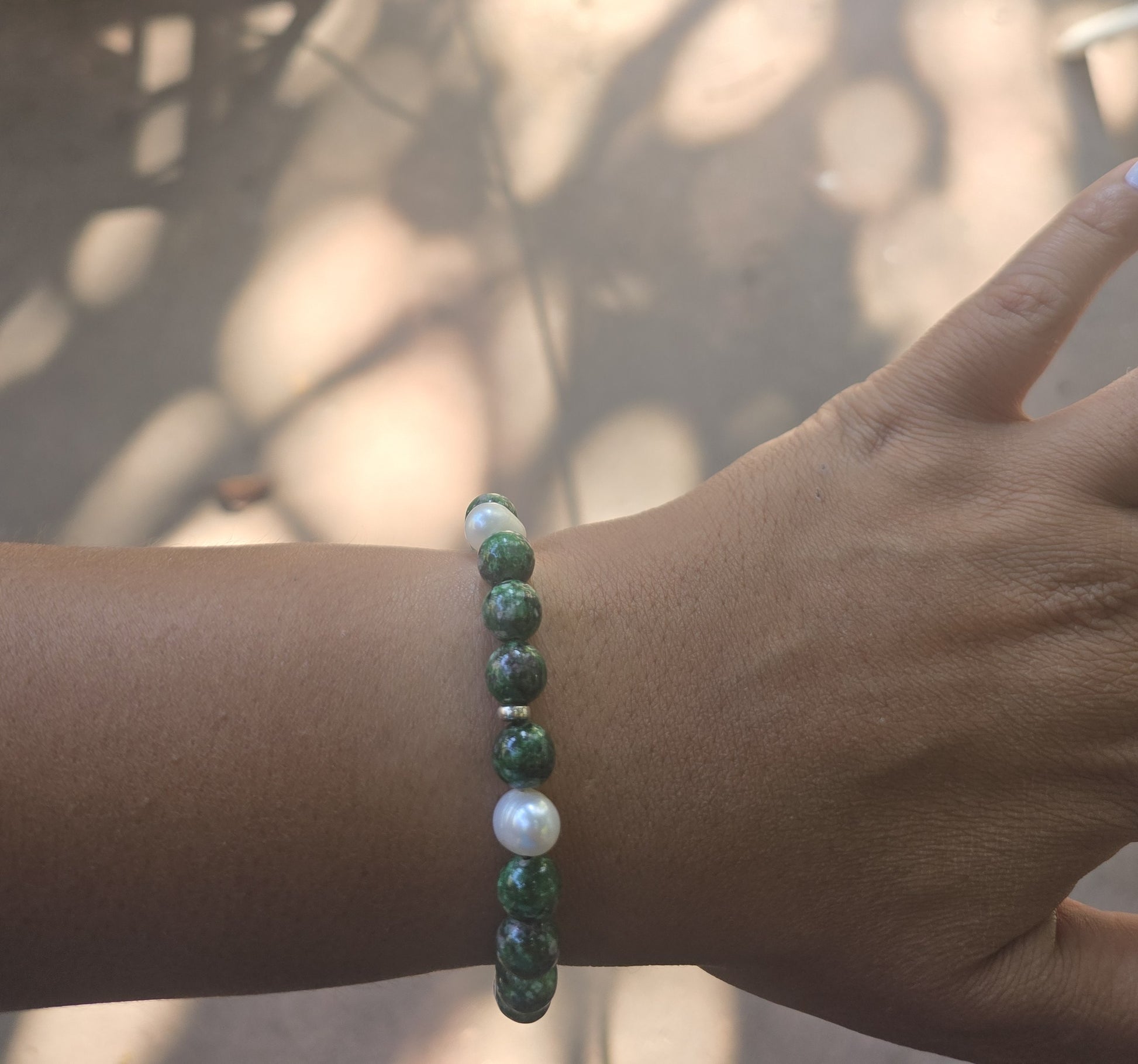 Pulsera de Zoisita, perla y plata 950. Gancho normal